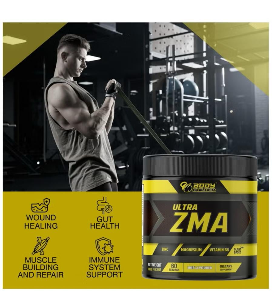ZMA هو مكمل شائع بين لاعبي كمال الأجسام، يجمع بين الزنك، ومغنيسيوم الأسبارتات، وفيتامين B6 لتعزيز تعافي العضلات، وتحسين جودة النوم، ودعم مستويات هرمون التستوستيرون الطبيعية. يساعد الزنك في تخليق البروتين ودعم المناعة، وهو أمر أساسي لنمو العضلات والتعافي، بينما يلعب المغنيسيوم دورًا في استرخاء العضلات، مما يقلل من التشنجات والتعب. يدعم فيتامين B6 أيض الطاقة، مما يعزز القدرة على التحمل أثناء التمارين. معًا، تعمل هذه المكونات على تعزيز النوم المريح والتوازن الهرموني، وكلاهما ضروري لإصلاح العضلات وتحسين الأداء الرياضي.